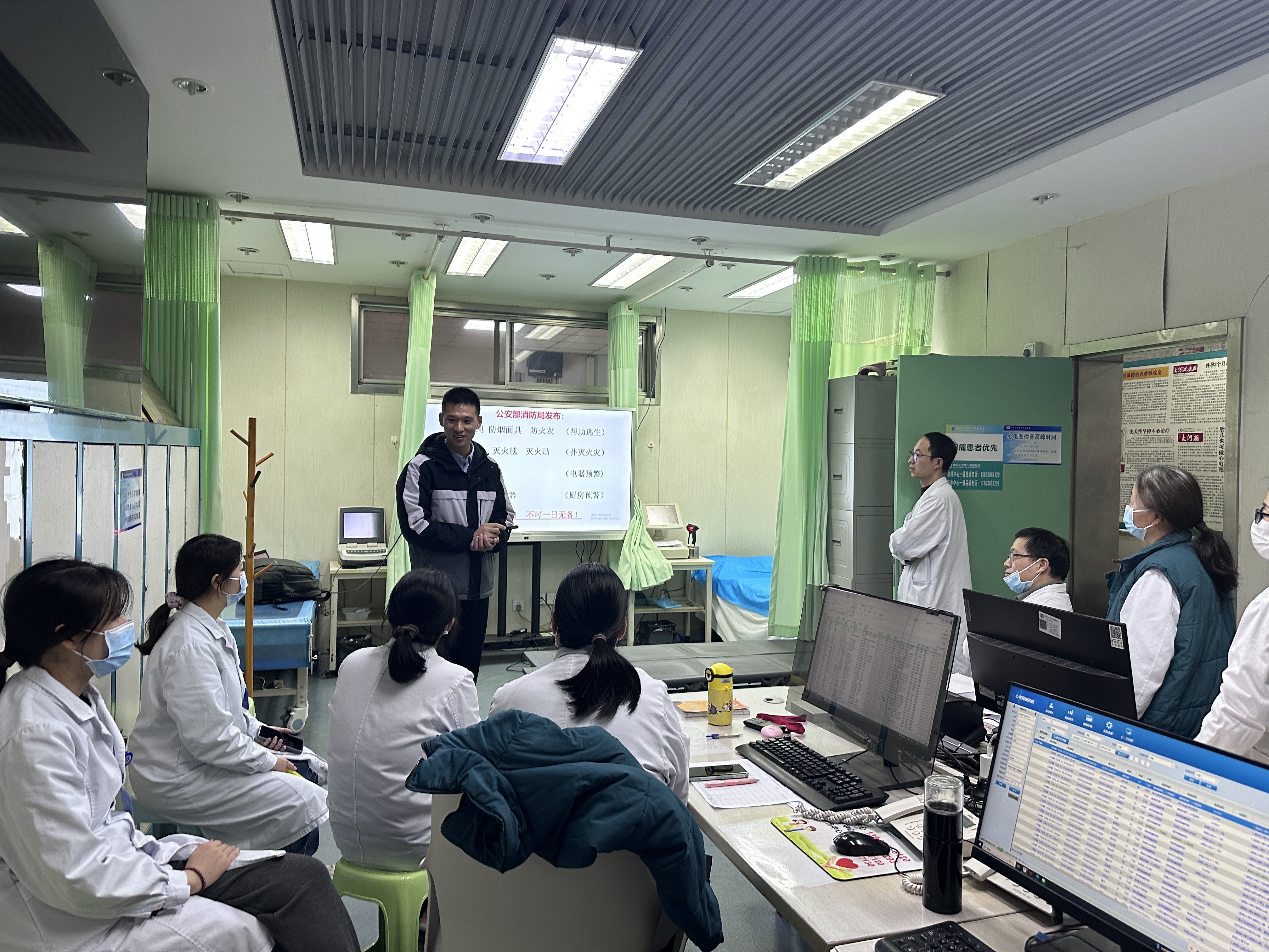 为进一步筑牢科室安全生产防线,提升全体医务人员在突发灾害面前的避险自救与协同作战能力,2026年1月29日下午,郑州大学第二附属医院心电图科特邀消防支队专业教官在科室内开展了一场以“强化消防意识,共筑平安医院”为主题的消防安全知识培训及现场教学活动。