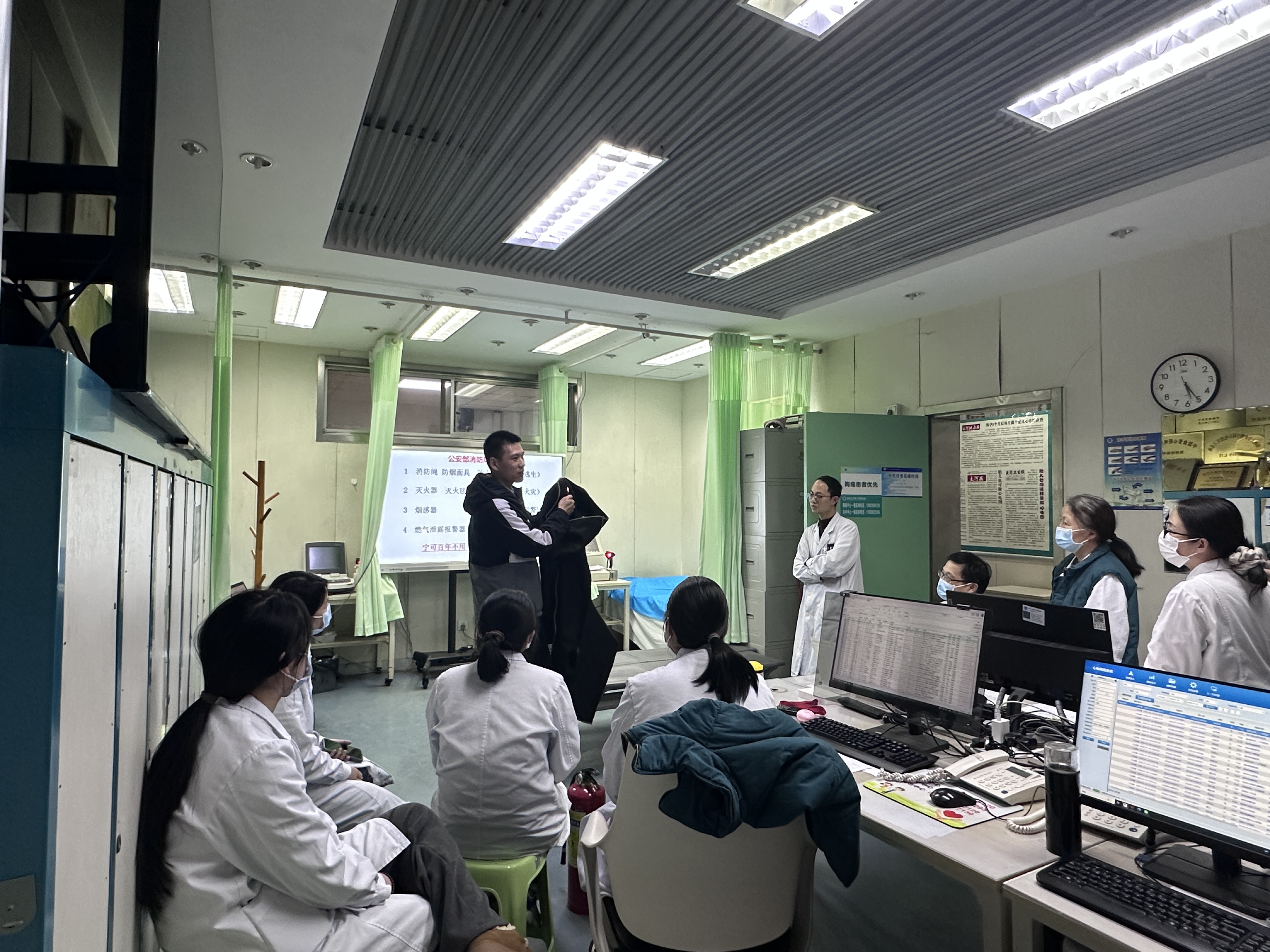 培训伊始,教官通过复盘近年来国内发生的典型火灾案例,配合一张张触目惊心的现场画面及监控影像,直观地展示了火灾的破坏力与疏于防范的严重后果。针对心电图科医疗精密设备密集、且受检患者流动性强等特点,有针对性地讲解了科室日常巡查中容易忽视的细节,包括电气线路老化检测、多插座负荷管理以及医疗设备使用完毕后的断电流程,并系统传授了应对初期火情“黄金三分钟”的扑救策略与防烟自救逃生技巧。