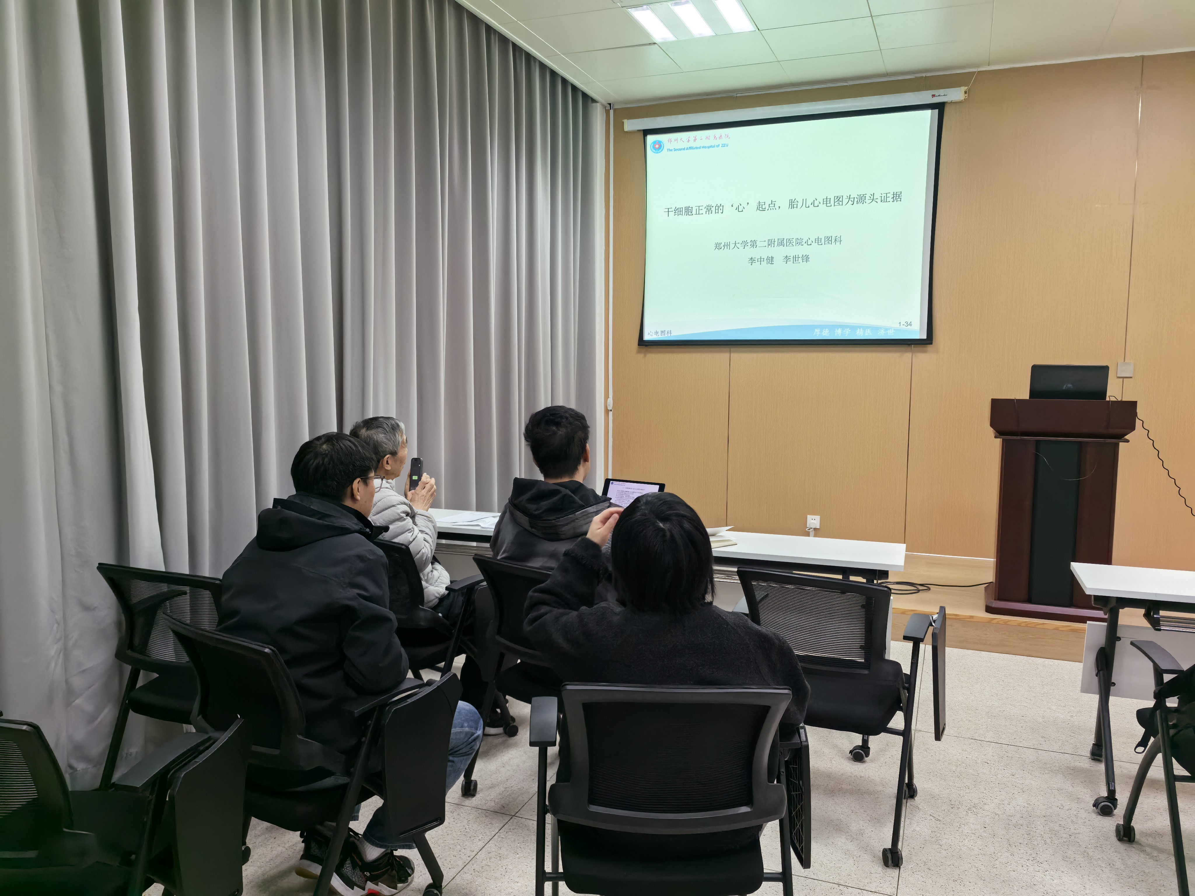 报告结束后,李中健教授、李世锋教授与河北大学电子信息工程学院科研团队举行了“干细胞正常的‘心’起点,胎儿心电图为源头证据的专题座谈会。双方聚焦“母胎信号分离”关键技术和“胎儿心电图机”的迭代研发,就技术路径优化及临床应用转化等议题交换了意见。李中健教授回顾了2025年9月首次到访时分享的胎儿心电图研究成果,强调团队正致力于建立中国胎儿心电图正常值数据库、制定相关指南与国际标准,并推动动态胎儿心电图研发,填补国际空白。此次交流进一步明确了下一步的方向,为联合攻关奠定了坚实基础。